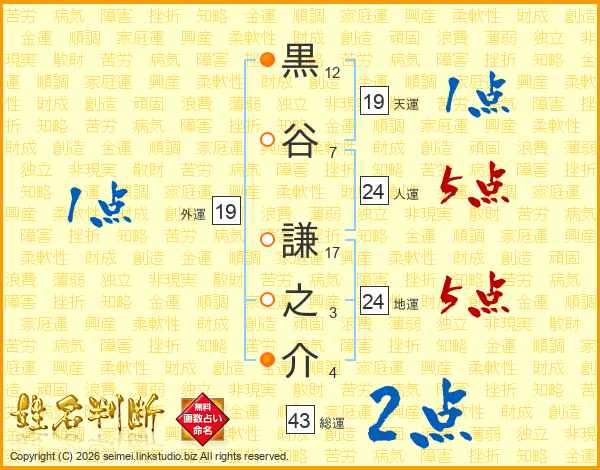 黒(12画)谷(7画) 謙(17画)之(3画)介(4画)