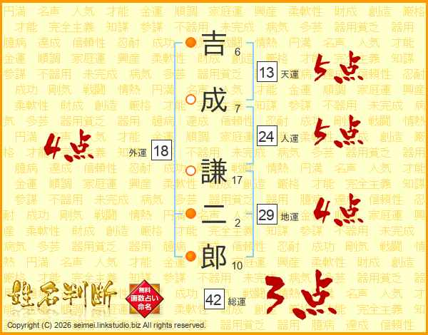 吉(6画)成(7画) 謙(17画)二(2画)郎(10画)
