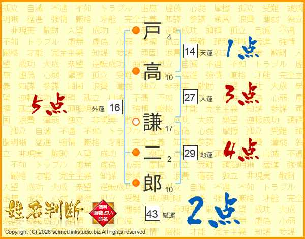 戸(4画)高(10画) 謙(17画)二(2画)郎(10画)