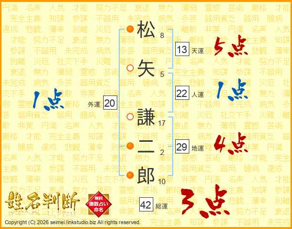 松(8画)矢(5画) 謙(17画)二(2画)郎(10画)