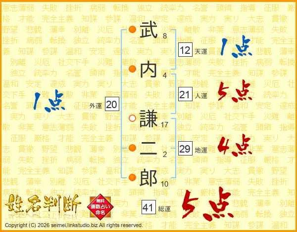 武内謙二郎さんの総運は41画の5点!