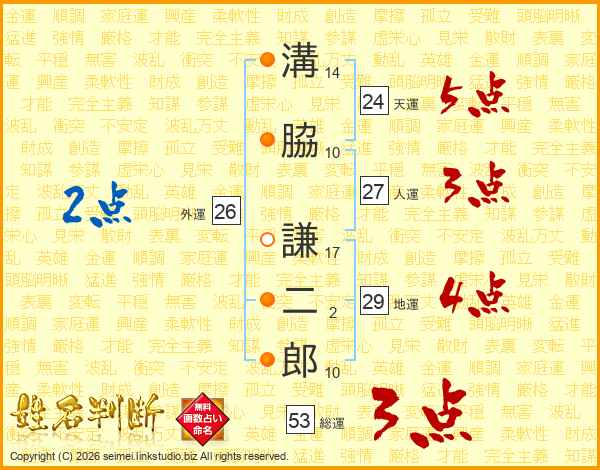 溝(14画)脇(10画) 謙(17画)二(2画)郎(10画)