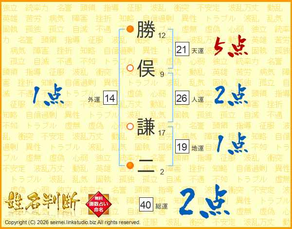 勝(12画)俣(9画) 謙(17画)二(2画)