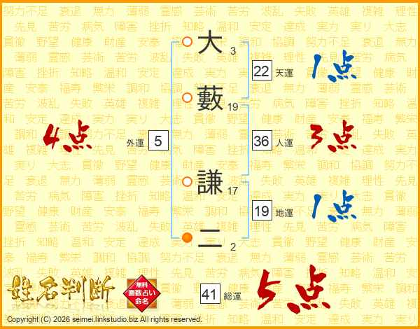 生活面を象徴する運勢です。外部から受ける影響力を表し、結婚運、家庭運や職場、環境への順応性を表します。総運から人運を引いた画数。姓や名が1文字の場合を除く。