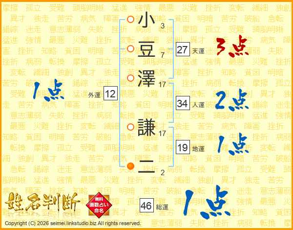 小(3画)豆(7画)澤(17画) 謙(17画)二(2画)