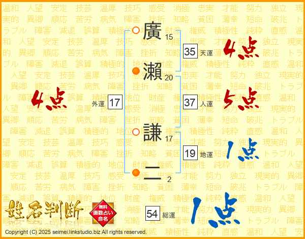 廣(15画)瀨(20画) 謙(17画)二(2画)