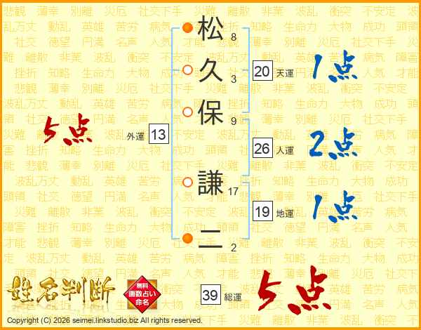 松(8画)久(3画)保(9画) 謙(17画)二(2画)