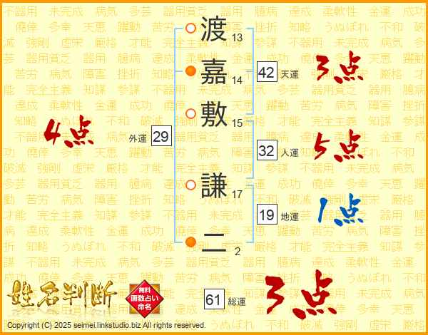 渡嘉敷謙二さんの外運は29画の4点!