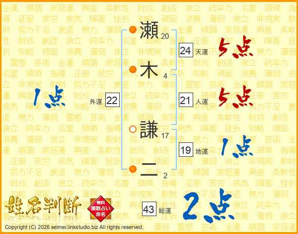 瀬(20画)木(4画) 謙(17画)二(2画)