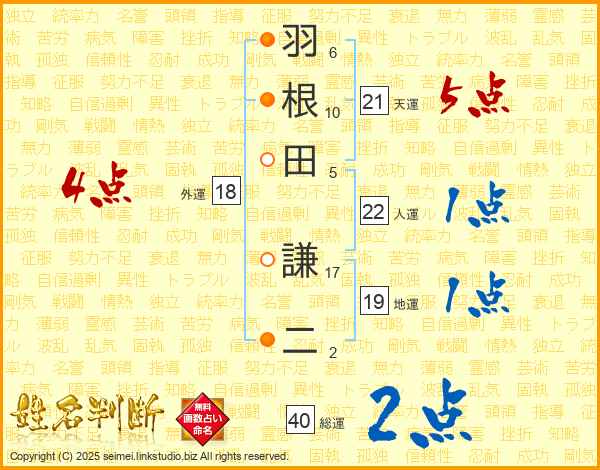 羽根田謙二さんの天運は21画の5点!