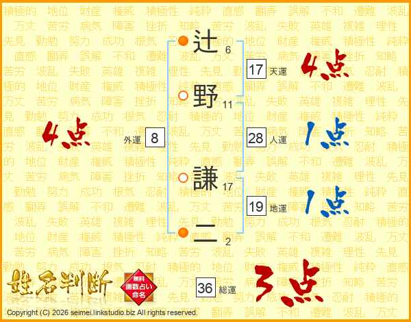 生活面を象徴する運勢です。外部から受ける影響力を表し、結婚運、家庭運や職場、環境への順応性を表します。総運から人運を引いた画数。姓や名が1文字の場合を除く。