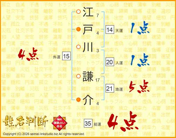 江(7画)戸(4画)川(3画) 謙(17画)介(4画)