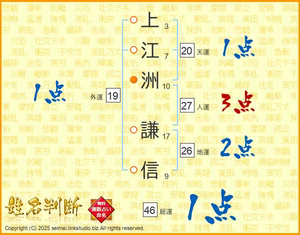 上(3画)江(7画)洲(10画) 謙(17画)信(9画)