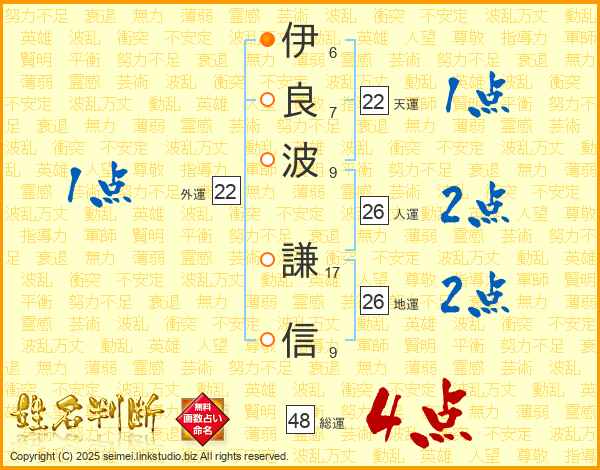 伊(6画)良(7画)波(9画) 謙(17画)信(9画)