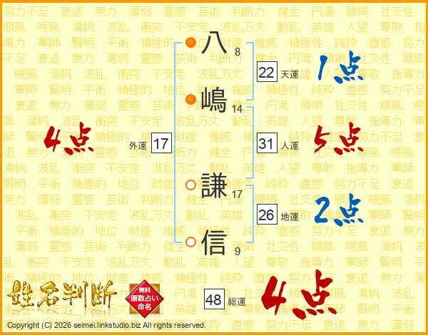 八嶋謙信さんの総運は48画の4点!