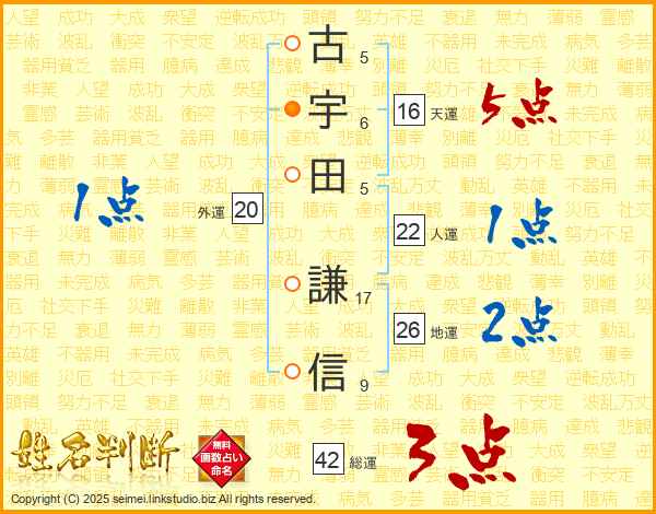 古(5画)宇(6画)田(5画) 謙(17画)信(9画)