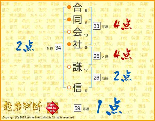 合(6画)同(6画)会(13画)社(8画) 謙(17画)信(9画)