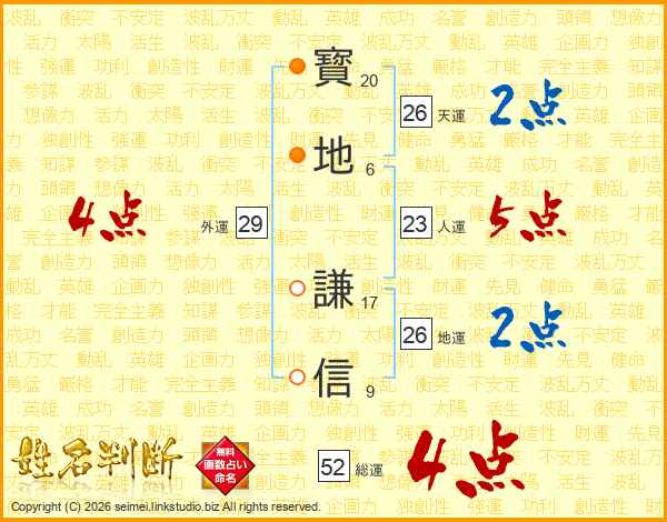 寳地謙信さんの総運は52画の4点!