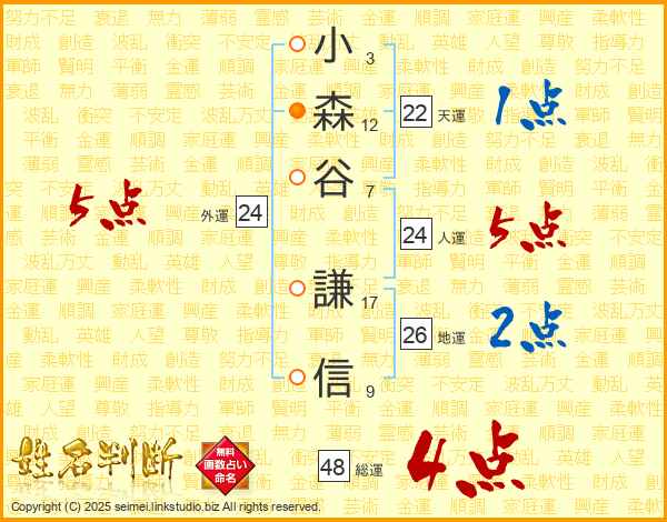 小(3画)森(12画)谷(7画) 謙(17画)信(9画)
