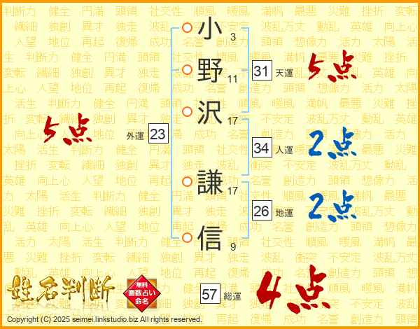小(3画)野(11画)沢(17画) 謙(17画)信(9画)