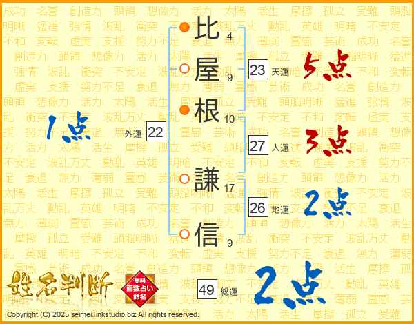 比(4画)屋(9画)根(10画) 謙(17画)信(9画)