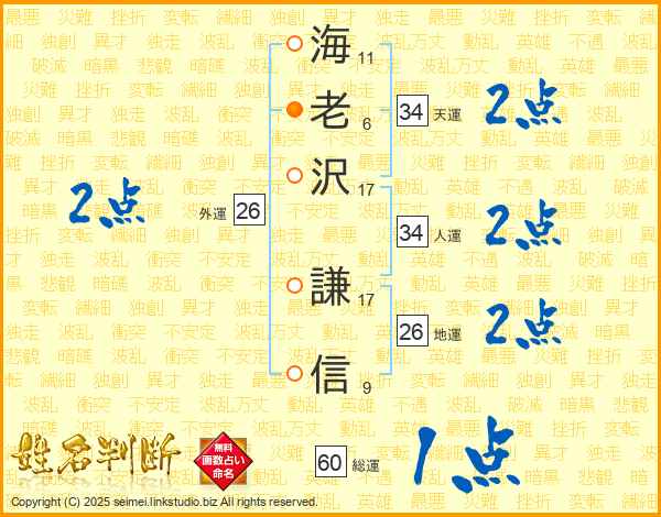 海(11画)老(6画)沢(17画) 謙(17画)信(9画)
