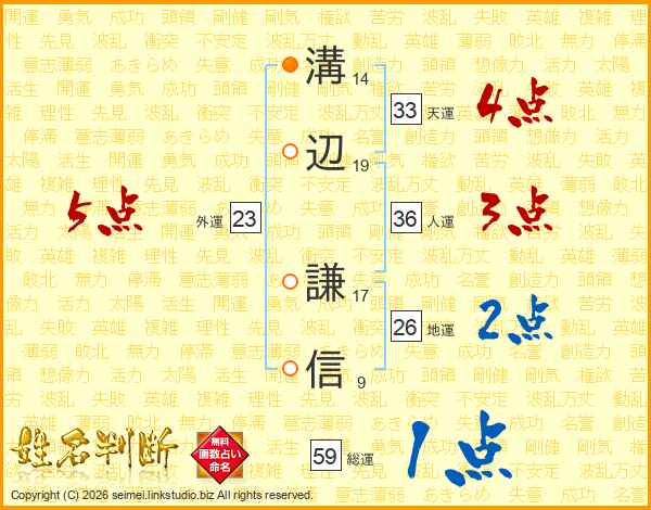 溝(14画)辺(19画) 謙(17画)信(9画)