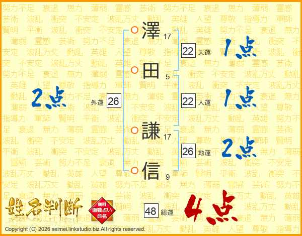 澤田謙信さんの地運は26画の2点!