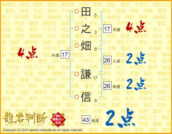 田(5画)之(3画)畑(9画) 謙(17画)信(9画)