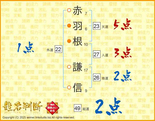 赤(7画)羽(6画)根(10画) 謙(17画)信(9画)