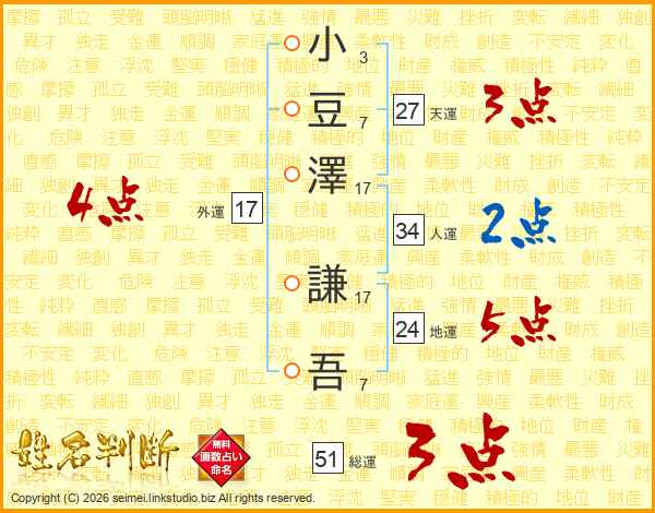 小豆澤謙吾さんの総運は51画の3点!