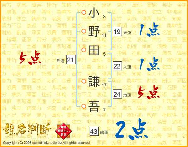 小(3画)野(11画)田(5画) 謙(17画)吾(7画)