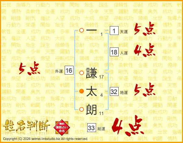 あなたの人生を表す1番重要な運勢です。生涯を通じて影響する総合運となり、主に50歳以降の晩年期に影響を及ぼします。苗字と名前の合計画数。