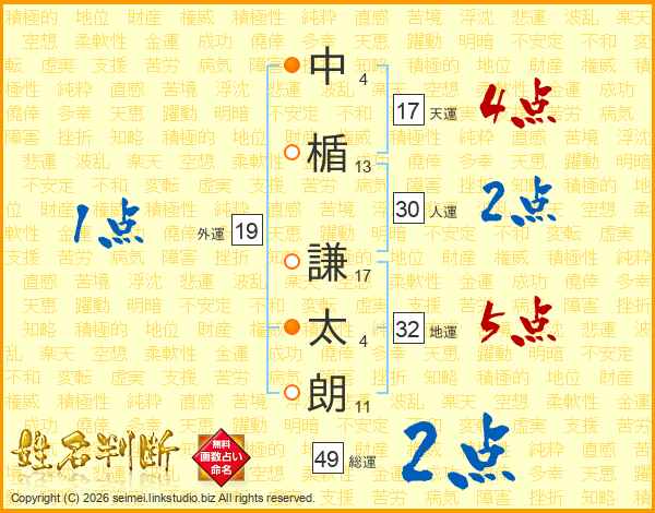 中(4画)楯(13画) 謙(17画)太(4画)朗(11画)