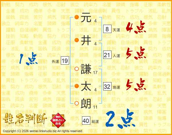 元(4画)井(4画) 謙(17画)太(4画)朗(11画)