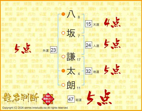八(8画)坂(7画) 謙(17画)太(4画)朗(11画)