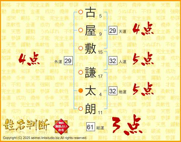 古(5画)屋(9画)敷(15画) 謙(17画)太(4画)朗(11画)