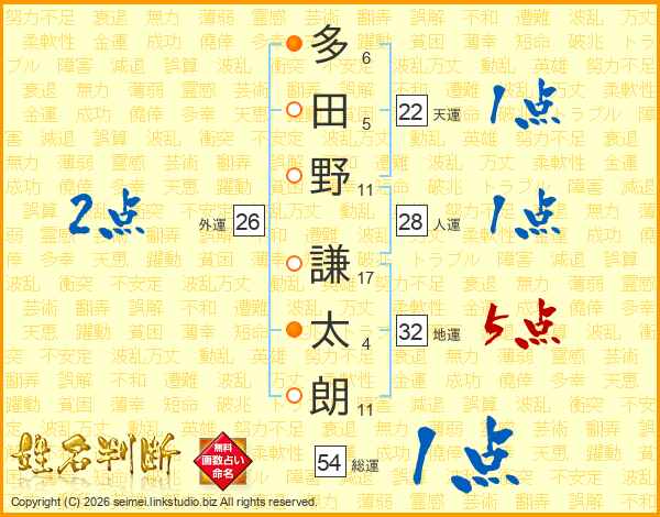 多(6画)田(5画)野(11画) 謙(17画)太(4画)朗(11画)