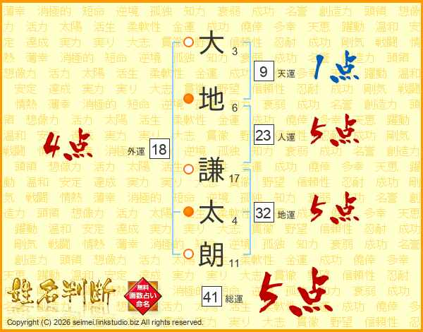 大(3画)地(6画) 謙(17画)太(4画)朗(11画)