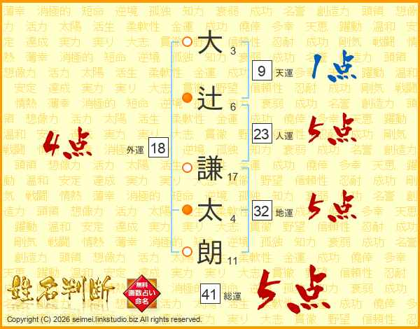 大(3画)辻(6画) 謙(17画)太(4画)朗(11画)