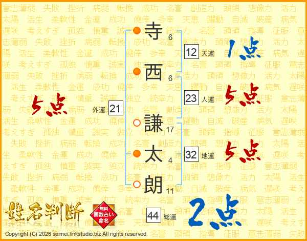 寺(6画)西(6画) 謙(17画)太(4画)朗(11画)