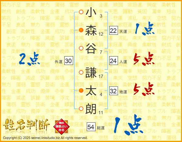 小(3画)森(12画)谷(7画) 謙(17画)太(4画)朗(11画)