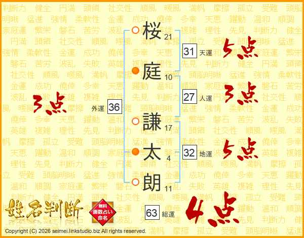 桜(21画)庭(10画) 謙(17画)太(4画)朗(11画)