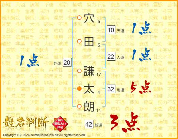 穴(5画)田(5画) 謙(17画)太(4画)朗(11画)
