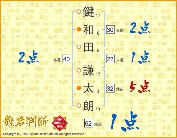 鍵(17画)和(8画)田(5画) 謙(17画)太(4画)朗(11画)