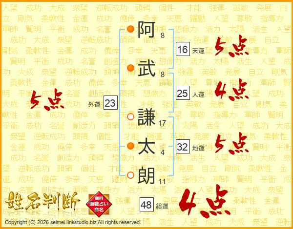 阿(8画)武(8画) 謙(17画)太(4画)朗(11画)