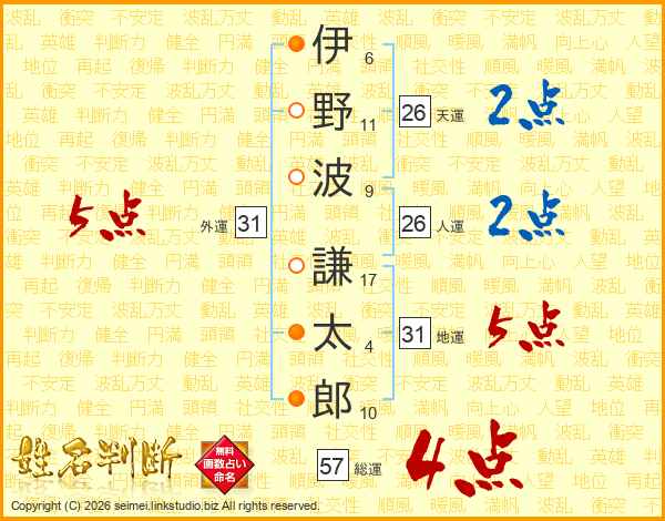 伊(6画)野(11画)波(9画) 謙(17画)太(4画)郎(10画)