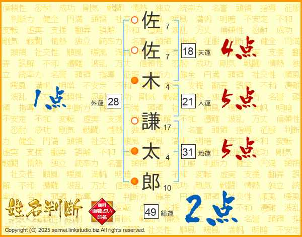 佐(7画)佐(7画)木(4画) 謙(17画)太(4画)郎(10画)