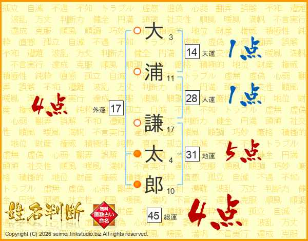 大(3画)浦(11画) 謙(17画)太(4画)郎(10画)