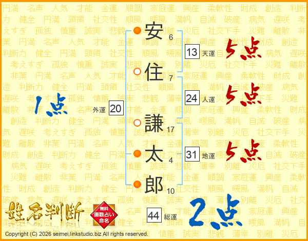 安(6画)住(7画) 謙(17画)太(4画)郎(10画)